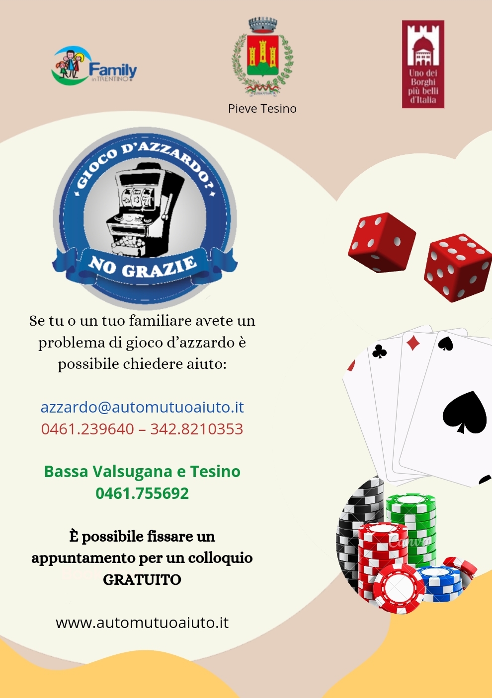 Descrizione Se tu o un tuo familiare avete un problema di gioco d'azzardo è possibile chiede aiuto:azzardo@automutuoaiuto.it0461/2039640-342 821 0353E' possibile fissare un appuntamento per un colloquio GRATUITO